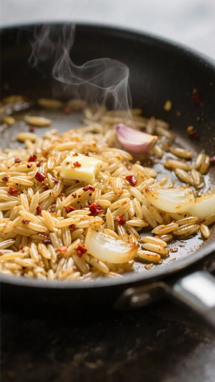 - Toast the orzo: Add orzo to the skillet. Stir to coat in butter and aromatics, and toast for 1–2 minutes until slightly golden. This boosts flavor and helps the orzo stay pleasantly firm.