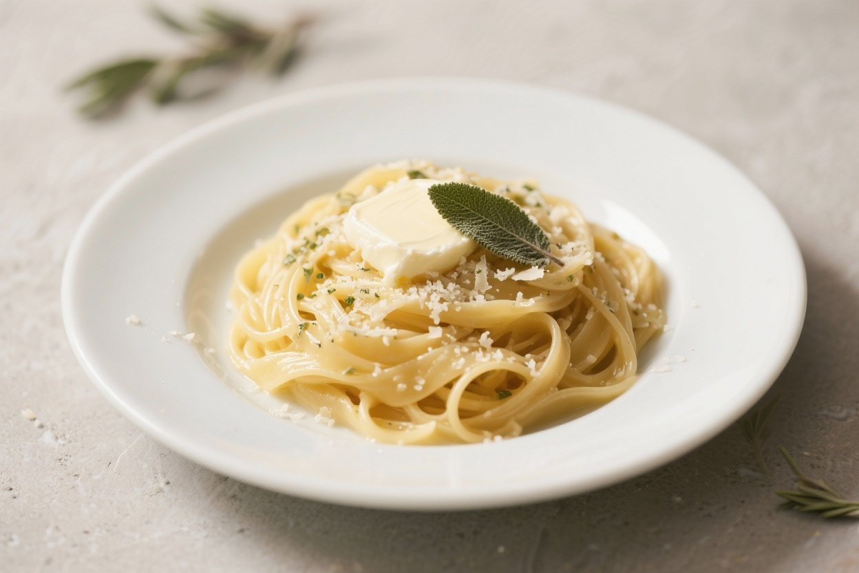 Final dish presentation: Beautifully plated pasta with butter, Parmesan, and sage twirled into a nea