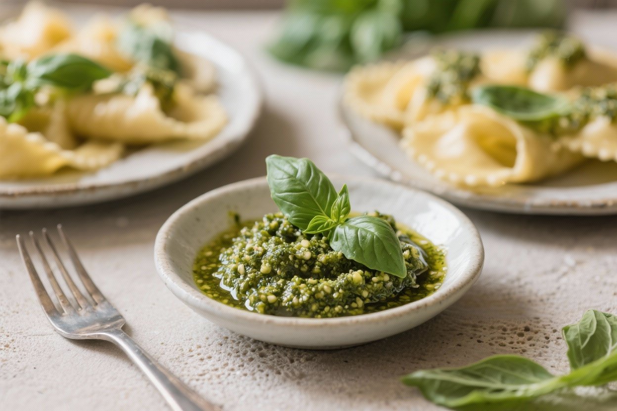 This pesto stays true to the Ligurian spirit: fresh basil, pine nuts, garlic, aged cheese, and good olive oil. The rustic touch comes from using a mortar and pestle or a low-speed blend to preserve texture and prevent bitterness.
