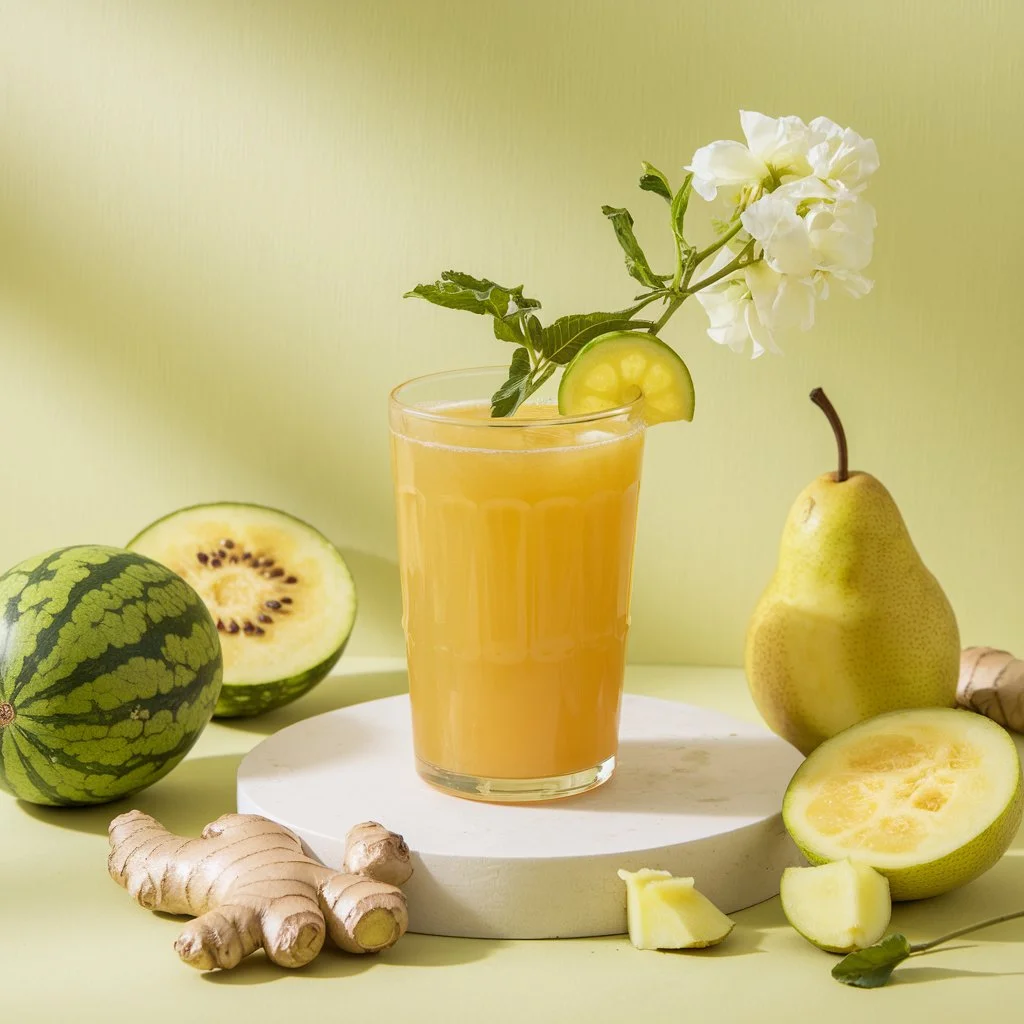 Yellow watermelon provides hydration and essential electrolytes like potassium, helping you stay refreshed and avoid dehydration. Pears aid digestion and promote gut health with their fiber content, and ginger helps reduce inflammation and improve circulation. Together, they make this juice not just tasty, but functional.