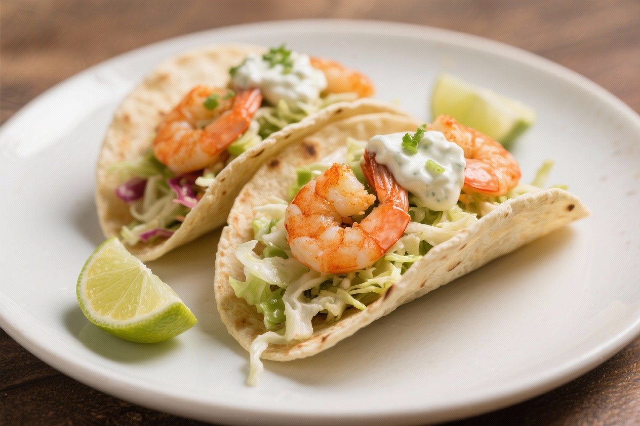 Store shrimp, slaw, crema, and tortillas separately. Shrimp keep 2 days in the fridge; reheat gently. The slaw stays crisp for about a day, and the crema lasts up to 3 days.