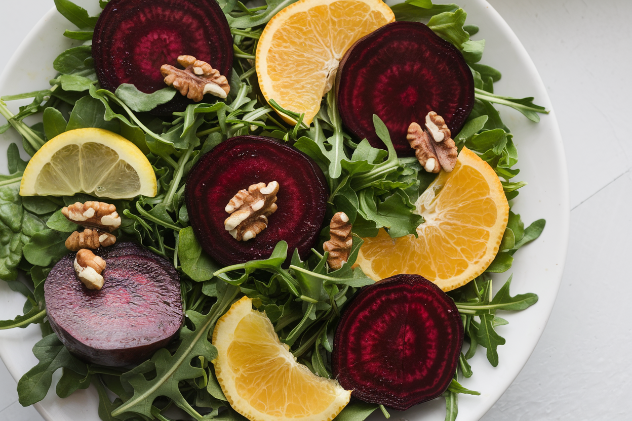 Beets are loaded with nitrates (great for blood flow) and fiber (great for your gut). Arugula is a vitamin K powerhouse. Citrus brings a mega-dose of vitamin C, and the nuts add healthy fats.