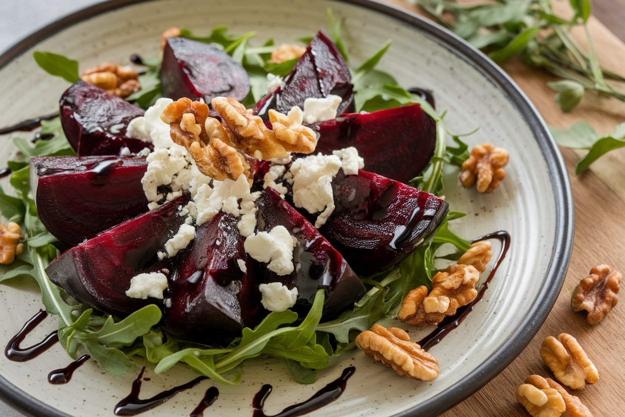 Start with arugula. Layer on the sliced beets. Scatter goat cheese and walnuts like you’re styling a magazine shoot. Drizzle dressing or glaze over the top. Try not to drool.