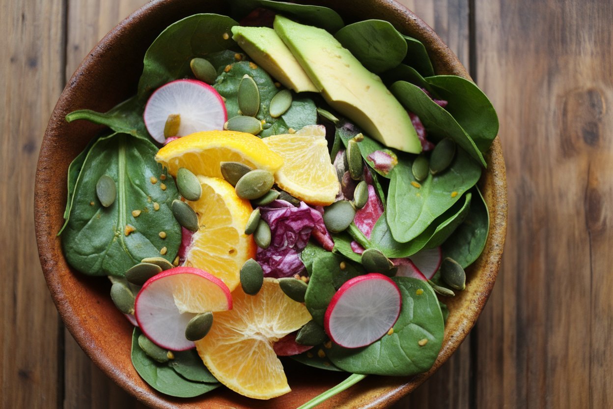 Spinach, radish, orange, and avocado come together like a wellness dream team. You get greens, crunch, zing, and creamy richness in one glorious, feel-good bowl. It’s the kind of salad that makes you feel smug in the best way — like, “Wow, I’m actually taking care of myself right now.”