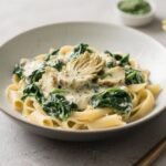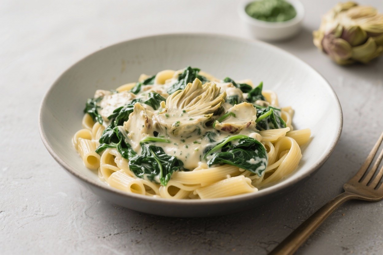 Canned artichokes bring a briny, savory pop that keeps the sauce from feeling heavy. Fresh spinach wilts into the pasta for color, nutrients, and freshness. The result is a balanced dish that tastes indulgent but sits light.